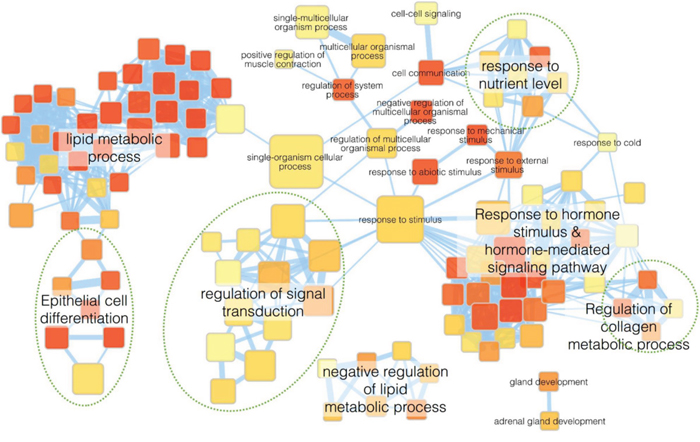 Figure 7: Functional maps of genes with altered expression after GALNT2 knockdown in AGS cells. Enrichment results of GALNT2 knockdown in AGS cells were mapped as networks. Nodes represent enriched gene sets (p < 0.05), and edges represent gene overlap scores between nodes above the threshold (0.6). Node color indicates enrichment p-value (red: low; yellow: high). Node size is proportional to the number of genes belonging to the corresponding gene set. Edge thickness is proportional to the overlap score. Groups of functionally related gene sets are highlighted in colors and labeled.