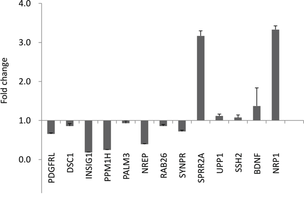 Figure 8: Quantitative RT-PCR validation of microarray results. Altered expression (fold change) of selected genes upon GALNT2 knockdown in AGS cells compared with control. Values greater than 1 represent gene upregulation and values less than 1 represent gene downregulation. Results were analyzed from three independent GALNT2 knockdown AGS cell groups and their corresponding controls and are presented as mean ± SD.