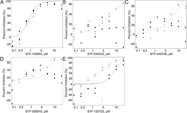 Figure 1: Candidate compound counter-selection. From 114, 124 compounds, 980 were selected for counter-screening against KG-1 CMV cells. This was done in order to discriminate between compounds that only suppressed CREB-driven luciferase activity (grey) and those that non-specifically suppressed luciferase (black) in both AML cell lines. (A) Representative graph of compounds that reduced luciferase activity in both cell lines equally. (B–E) Representative graphs of compounds with an IC50 2-fold higher in KG-1 CMV cells compared to KG-1 CRE cells (were more potent against KG-1 CRE cells) were selected for further study. From 980 compounds, 23 were selected for further study.