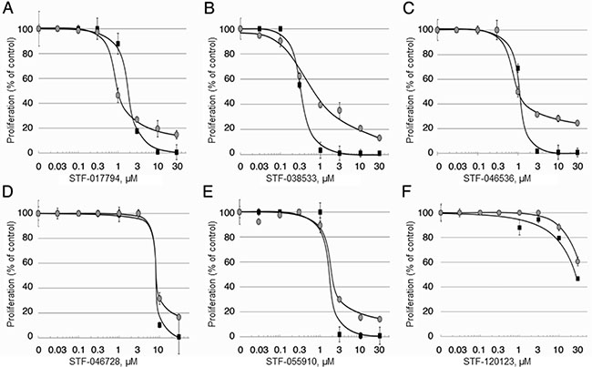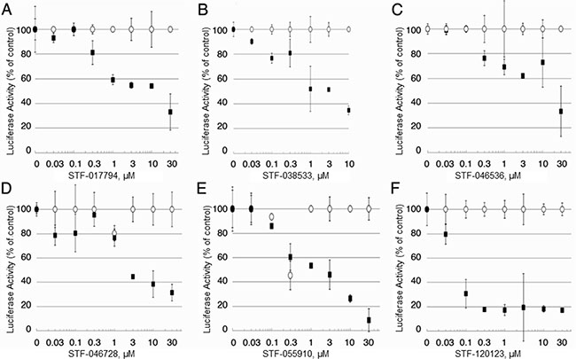 Figure 2: Candidate compound selectivity for CREB-driven vs. non-CREB-driven luciferase expression. (A–F) The 23 compounds with putative selectivity for CREB-driven luciferase expression were tested in upscaled luciferase assays using KG-1 CRE and KG-1 CMV AML cells. In these extended assays, 6 of 23 compounds (STF-017794, STF-038533, STF-046536, STF-046728, STF-055910 and STF-120123) showed very little activity in suppressing non-CREB-driven luciferase expression (white), but were able to suppress CREB-driven luciferase expression (black) with at least three concentrations of compound.
