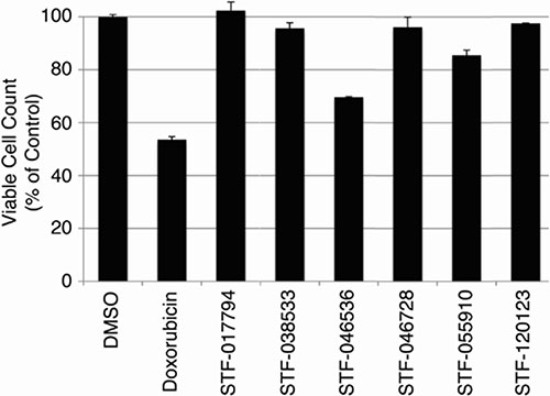Figure 4: Toxicity of candidate compounds to normal bone marrow cells in vitro. To evaluate the potential toxicity of these compounds against non-cancer cells, cultured bone marrow cells from human donors were treated with each of 6 candidate compounds (10 μM) for 72 hours. Doxorubicin (3.8 μM) was used as a positive control. The viable cell count, shown as a percent of viable cells remaining after DMSO (vehicle) treatment, remained > 95% of control for cells treated with STF-017794, STF-038533, STF-046728 and STF-120123.
