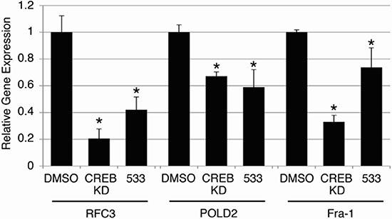 Figure 5: On-target effects of candidate compound STF-038533. To assess whether compound STF-038533(533) exerted ‘on-target’ effects on validated CREB target genes, the expression of RFC3, Fra-1 and POLD2 were examined following 24 hours of treatment with STF-038533 (10 μM) and compared to KG-1 cells in which CREB expression was reduced by shRNA(CREB KD). Each of these genes exhibited significantly reduced expression compared to control cells, treated with DMSO (*p < 0.05).