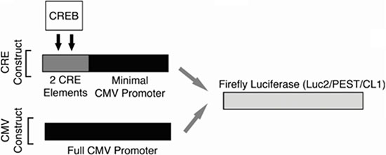 Figure 6: High-throughput screening strategy. Promoter schematics for the two KG-1 cell lines generated for use in the high-throughput screen. For both cell lines, a Firefly luciferase gene containing two C-terminal protein destabilizing sequences (hCL1 and h PEST) was used in order to reduce this protein’s half-life and facilitate early changes in the expression of this reporter gene. The promoter for CREB-specific expression of luciferase was composed of two ‘CRE’ elements, which are the canonical CREB DNA-binding sequences, placed within −200 of the ATG start site and 5′ to the CMV minimal promoter (KG-1 CRE cells). For non-specific luciferase expression, the full CMV promoter (KG-1 CMV cells) was placed 5′ to the luciferase gene.