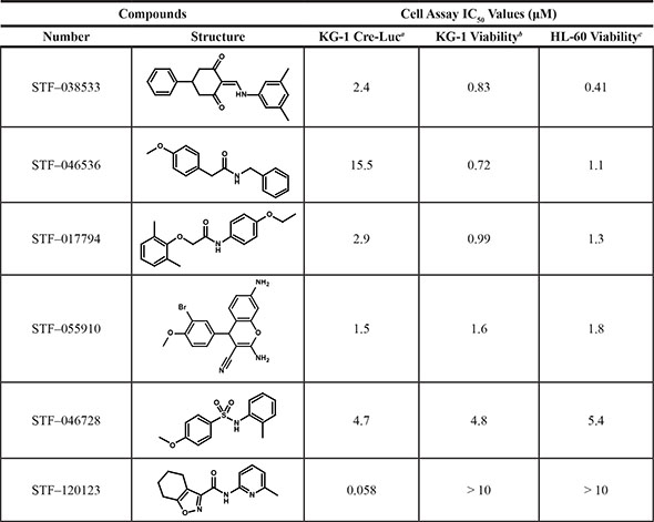 To examine whether these compounds were able to kill AML cells in vitro, well-characterized HL-60 and KG-1 cells were treated with compound concentrations ranging from 30 nM to 30 μM for 72 hours. Dose-response curves for each of these six compounds were generated using the Promega CellTiter Glo Viability Assay. Five compounds showed low micromolar IC50 values when tested against unmodified HL-60 and KG-1 AML cell lines for 72 hours (Figure 3 and Table 3). Compound STF-038533 showed an IC50 of 410 nM, a potency comparable to that of rationally-designed drugs in clinical use such as sorafenib or ABT-737 [10, 11]. In contrast, compound STF-120123, which showed excellent selectivity in decreasing CREB-driven luciferase activity in KG-1 CRE vs. KG-1 CMV cells, showed low potency in these assays. Nonetheless, the potency of the five best compounds compare favorably to potency values reported for conventional chemotherapeutics used in AML treatment regimens, including cytarabine, doxorubicin and etoposide, when tested similarly in vitro. The structures of each library hit are shown along with a summary of the cell-based IC50 values (Table 3). Various chemotypes are represented, reflecting the diversity of the library.