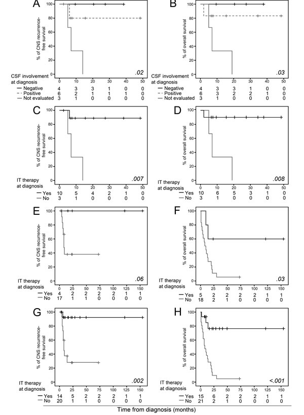 Figure 1: Prognostic impact of (occult) CSF involvement and administration of IT therapy at diagnosis in BPDCN patients. CNS-RFS (panels A, C, E and G) and OS (panels B, D, F and H) curves are separately shown for the prospective cohort (panels A, B, C and D), the validation cohort (panels E and F) and the combined (prospective and validation) cohort (panels G and H).