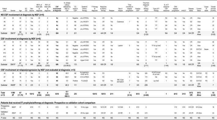 BM: Bone marrow; PB: Peripheral blood; CSF: Cerebrospinal fluid; IT: Intrathecal; CNS: Central nervous Sytem; AHSCT: Allogeneic hematopoietic stem cell transplantation; M: Male; F: Female; NE: Not evaluated; ALL: Acute Lymphoblastic Leukemia; NHL: Non-Hodgkin Lymphoma; AML: Acute Myeloblastic Leukemia; CR: Complete remission; ED: Early death; SD: Stable disease; NR: Not reported; TIT: Triple intrathecal therapy (Methotrexate cytarabine and hydrocortisone); AraC: Cytarabine; MTX: Metothrexate; Dex: Dexamethasone; PD: Progressive disease; TreatTox: Treatment toxicity; NS: Not statistically significant. |