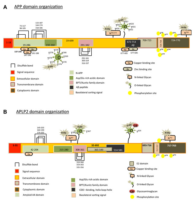 Figure 1: Graphical representations of the domains and sub-domains for APP and APLP2 are shown, along with disulfide bonds and predicted post-translational modifications. A. For APP, the 770 amino acid isoform (UniProt accession number P05067) is displayed. B. For APLP2, the 763 amino acid isoform (UniProt accession number Q06481) is shown. N-glycan prediction was done with the NetNGlyc 1.0 Server (http://www.cbs.dtu.dk/services/NetNGlyc/). O-glycan prediction was performed by NetOGlyc 3.1 Server (http://www.cbs.dtu.dk/ services/NetOGlyc/). Phosphorylated residues were predicted with PhosphoSite (http://www.phosphosite.org/ homeAction.do). For some isoforms of APLP2, but not of APP, chondroitin sulfate (CS) glycosaminoglycan modification occurs at Serine 614.