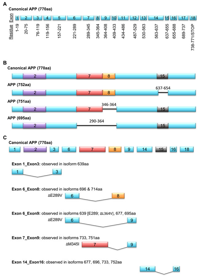 As is the case with APLP2, splicing also leads to generation of APP variants that differ in molecular mass. Alternative splicing of APP RNA gives rise to at least 9 translated isoforms, with variable expression across normal and disease states. The largest isoform, which contains the sequences encoded by all 18 exons, is 770 amino acids in length (Figure 4A). Aside from the canonical APP-770, the other primary APP isoforms contain 751 or 695 amino acid residues (Figure 4B). Some APP splice variants are restricted in localization. For example, APP-751 and APP-695 are abundantly present in mammalian brain [51-53], and APP 752, 733, 696, and 677 are found in astrocytes and leukocytes [54]. Upon mitogenic stimulation with phytohemagglutinin, T cells secrete APP-733 [55]. In the various APP isoforms, the spliced regions include a group of N-terminal residues near a heparin-binding domain (exon 2), the Kunitz-type protease inhibitor domain (exon 7), an OX-2 antigen domain (exon 8), and the amyloid beta processing sequence (exon 15) (Figure 4C).