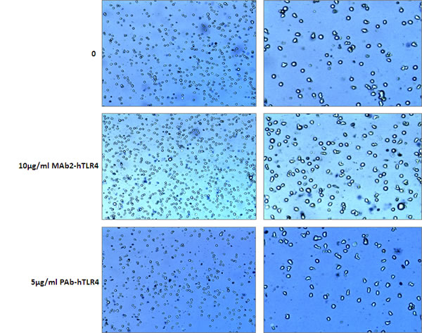 Figure 1: Cytotoxicity assay for MAb2-hTLR4 and PAb-hTLR4. MonoMac 6 cells were incubated with 10μg/ml MAb2-hTLR4 or 5μg/ml PAb-hTLR4 for 16h. A cytotoxicity assay was conducted using trypan blue staining and cell counting on a Luna II automated cell counter. Cell viability was 100% in untreated and MAb2-hTLR4-treated cells, and 94% in those incubated with PAb-hTLR4. Images on the right are magnified versions of those on the left.