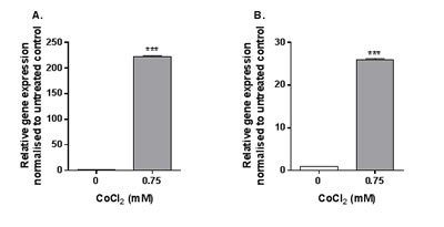 Figure 3: CCL20 and IL1A expression following CoCl2 stimulation. MonoMac 6 cells were stimulated with 0.75mM CoCl2 for 4h before qRT-PCR was conducted to assess A. CCL20 and B. IL1A expression. Data is representative of three independent experiments and statistical significance was calculated by Student’s t test.