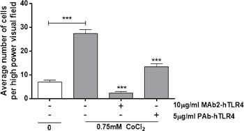 Conditioned media from cobalt-stimulated MonoMac 6 cells significantly increased neutrophil migration (p<0.001) (Figure 5). Both MAb2-hTLR4 and PAb-hTLR4 pre-incubation significantly inhibited this effect (both p<0.001) although the monoclonal antibody induced a greater reduction in migration than the polyclonal.