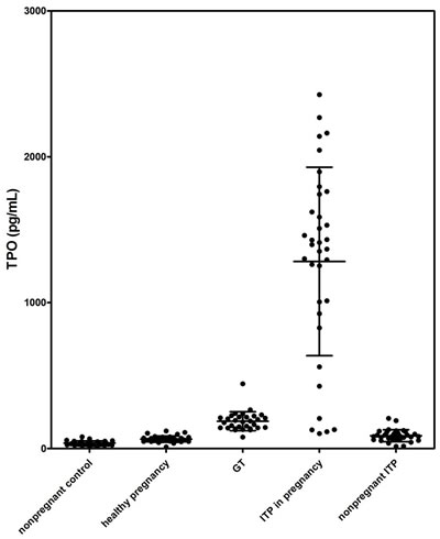 In conclusion, we demonstrated that ITP in pregnancy displayed a significantly higher TPO level compared to GT. Although the exact mechanism for elevated TPO levels of ITP in pregnancy patients remains unclear, measurement of its concentration could be an important diagnostic tool for differentiate ITP in pregnancy from GT. In addition, the pathogenesis of ITP in pregnancy might be different from that of nonpregnant ITP, the exact mechanism will need to be elucidated with further research.