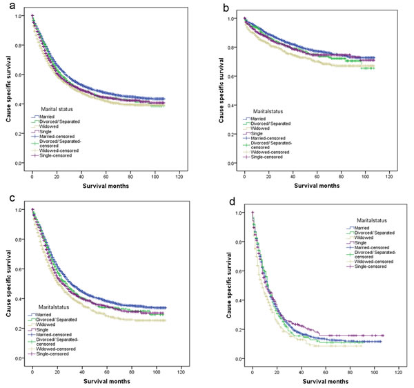 Gastric cancer represents a major cause of cancer mortality because of its poor prognosis [1]. The only potentially curative treatment for gastric cancer is complete resection (R0). However, even after surgical management, the 5-year overall survival rate is only about 20% in series from the United States [2]. Several parameters could be used to predict survival outcomes in patients with gastric, including clinicopathological factors, adjuvant therapy, socioeconomic status, and psychiatric supports, such as, marital status. Married persons enjoy overall better health and increased life expectancy compared with the unmarried (divorced, separated, never married) [3-5]. Researches also indicate a survival advantage for married persons living with a chronic disease such as cancer. Accumulated studies have shown that marital status is an independent prognostic factor of survival in various cancer types [6-12]. In a larger population-based study on data from the Surveillance, Epidemiology and End Results (SEER) database indicated that unmarried patients are at significantly higher risk of presentation with metastatic cancer, undertreatment, and death resulting from their cancer in ten leading causes of cancer-related death [6]. To our knowledge, the impact of marital status on gastric cancer survival has not been previously studied. Data does exist to suggest that divorce, widowhood, and living alone increase the risk of each subtype of esophageal and gastric cancer [13], however, the analysis has not been extended to cancer outcome. Given that gastric cancer is one of the most common malignancies with high cancer-related deaths and marriage is an important aspect of adult life, it is important to explore the relationship between marital status and gastric cancer survival outcomes and the potential underlying mechanisms. In this study, we used data from the SEER cancer-registry program of individuals diagnosed between 2004 and 2012 to explore the impact of marital status on gastric cancer cause specific survival (CSS) in patients after surgical resection.