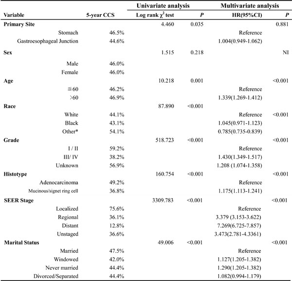 When multivariate analysis with Cox regression was performed, six variables were validated as independent prognostic factors,including age ( > 60 years, hazard ratio (HR) 1.339, 95 % confidence interval (CI) 1.269-1.412), race(black, HR 1.045,95%CI 0.971-1.123; others, HR 0.785, 95%CI 0.735-0.839), pathological grading(Grade III/IV , HR 1.430, 95% CI 1.349-1.517; unknown, HR 1.208, 95 % CI 1.074-1.358),histologic type (mucinous/signet ring cell, HR 1.175, 95% CI 1.113-1.241), SEER stage(Regional, HR 3.379 , 95% CI 3.153-3.622; Distant, HR 7.269, 95% CI 6.725-7.857;Unstaged, HR 3.473, 95% CI 2.781-4.361), marital status(widowed, HR 1.290,95 %CI 1.205-1.382; single, HR 1.127,95 %CI 1.048-1.213; divorced/separated, HR1.082, 95% CI 0.994-1.179).