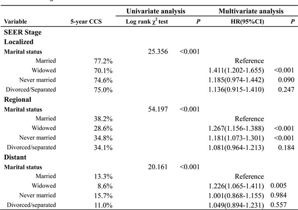 Table 3: Univariate and multivariate analysis of marital status on gastric cancer cause specific survival based on different cancer stage.