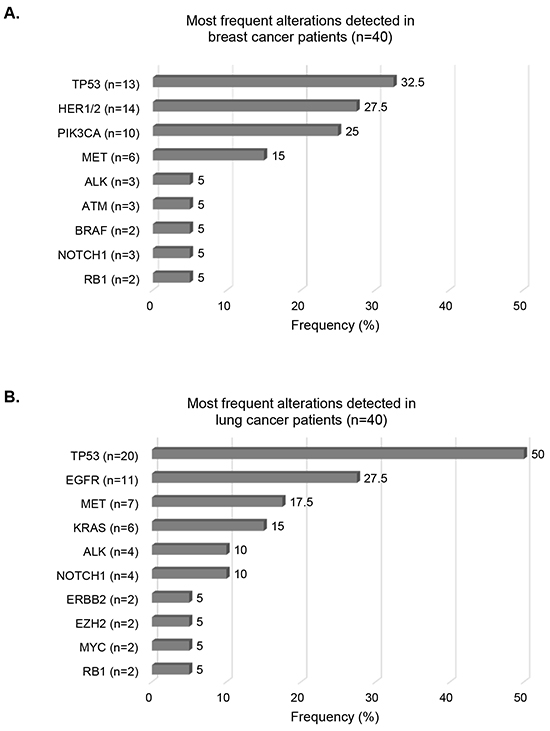 When examining the tumor types comprising the most patients (lung and breast cancers, each n=40), we found that the most frequent alterations reported were TP53 (32.5%), HER1/2 (27.5%), and PIK3CA (25%) in breast cancer cases (Figure 3A). In lung cancer cases, TP53 alterations were detected in 50% of the cases, followed by EGFR (27.5%) and MET (17.5%) alterations (Figure 3B).