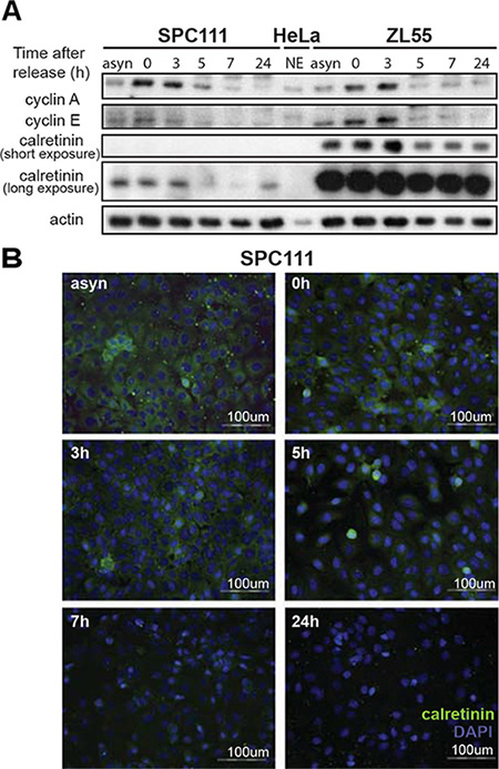 Figure 6: Cell cycle-dependent regulation of calretinin expression. (A) Calretinin levels in protein lysates from ZL55 and SPC111 synchronized cells collected at different time points (0 h, 3 h, 5 h, 7 h, 24 h) after removal of thymidine block. Analysis of cyclin A and cyclin E expression was used as a reference for cell cycle progression. A nuclear extract of HeLa cells is used to identify the position of the bands of cyclin A and cyclin E Due to the considerably different calretinin expression levels of ZL55 and SPC111 cells, two different exposure times are presented. (B) Immunofluorescence analysis of SPC111 cells using calretinin antibody (green) at the same time points as in (A) Cells nuclei are stained with DAPI (blue), and calretinin immunofluorescence is shown in green.