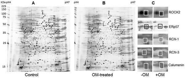 Figure 2: Protein profile differences between Control and OM-treated RD cells. A. and B. representative silver-stained 2-DE maps of proteins from DMSO and 30 μM of OM (resolved in DMSO) treated RD cells. Fifty two differential expressed spots were picked up for MALDI-TOF-MS and MS/MS analysis. The spots of eighteen differently expressed proteins identified were marked. C. The enlarged sections of the 2-DE map. Spot 4, RCN-3; spot 5, RCN-1; spot 6, calumenin; and spot 17, ERp57.