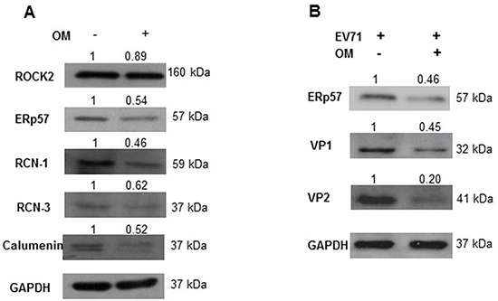 Figure 3: The suppression of ERp57 expression by OM. A. RD cells were treated with OM at 30 μM for 48 hours, and cell lysates were harvested and applied for Western blot assays. As shown, ERp57, RCN-1, RCN-2 and Calumenin were markedly down-regulated by OM treatment. B. Cells were pretreated with 30 μM of OM for 4 hours, and then infected with EV71 at MOI of 1 for 12 hours. As shown, OM suppressed the expression of ERp57, and viral proteins VP1 and VP2. The relative density value of each band to GAPHD was set as 1 in the control group.