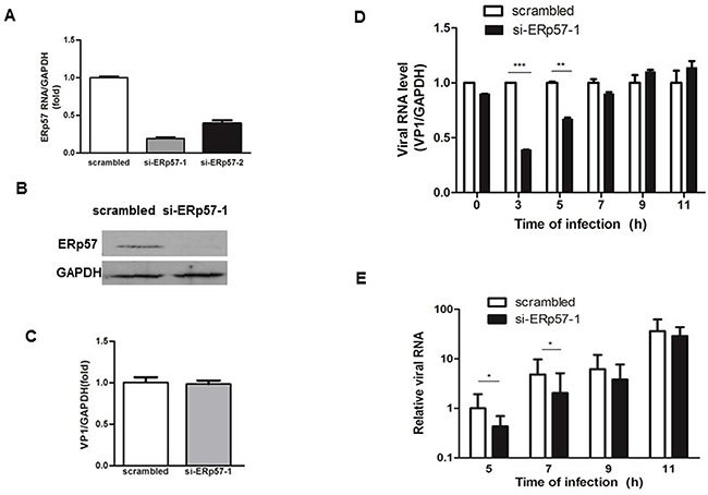 Figure 4: Inhibition of EV71 infection by Knockdown of ERp57 at early stage. A. Specific siRNAs targeting ERp57 were transfected into RD cells, and the effect of knockdown was determined by qRT-PCR 48 hours post-transfection. B. The ERp57 protein level detected by si-ERp57-1 knockdown. C. Knockdown of ERp57 did not affect EV71 entry. Forty eight hours post-transfection with siRNAs, cells were infected with EV71 at MOI of 1 for 1 hour (time point was set as 0 hour), and cells were washed with PBS for three times. The intracellular viral RNA level was determined by qRT-PCR. The mean value of VP1/GAPDH ratio was set as 1 in control. D. and E. The intracellular (D) and extracellular (E) viral RNA levels upon ERp57 knockdown at different time points. The total RNA was isolated from infected cells and corresponding media at different time points, and quantified by quantitative RT-PCR. At time point 0 hour, the intracellular viral RNA level (virions just entered the cells) were quantitated by qRT-PCR *, p < 0.05; **, p < 0.01; ***, p < 0.001.