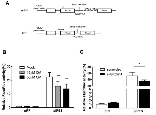 Figure 5: Inhibition of EV71 IRES activity by OM or knockdown of ERp57. A. Schematic diagram of plasmids pIRES and pRF for measuring IRES activity. B. OM inhibited IRES activity in a dose dependent manner. Cells were transfected with pIRES or pRF for 24 hours, and then treated without or with OM for 12 hour followed by luciferase assays. C. Knockdown of ERp57 reduced IRES activity. Cells were transfected with scramble siRNA or si-ERp57-1. Twenty four hours post-transfection, the cells were then transfected with pIRES or pRF for another 24 hours and applied for luciferase assays. The ratio of FLuc to RLuc activity was set as 1 when cells were transfected with pRL reporter plasmid in the control group (without OM treatment or transfected with scrambled siRNA). *, p < 0.05; ***, p < 0.001.