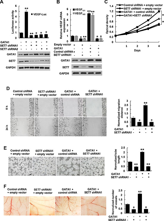 Figure 5: GATA1 modulates VEGF expression and VEGF-induced HUVEC proliferation, migration and tube formation as well as angiogenesis through SET7. (A) Luciferase reporter assays in MCF7 cells cotransfected with the VEGF-Luc reporter, GATA1 and SET7 shRNA1, SET7 shRNA2 or control shRNA. Representative Western blot shows the expression of GATA1 and SET7. (B) Real-time RT-PCR analysis of the VEGF121 and VEGF165 expression in MCF7 cells stably infected with lentiviruses carrying GATA1 and SET7 shRNA. Representative Western blot indicates the expression of GATA1 and SET7. (C) Cell proliferation assays in HUVEC cells cultured in conditioned medium from MCF7 cells stably infected as in (B). (D) Wound healing assays for HUVEC cells cultured in conditioned medium from MCF7 cells stably infected as in (B). Scale bar: 100 μm. (E) Tube formation assays for HUVEC cells cultured in conditioned medium from MCF7 cells stably infected as in (B). Scale bar: 100 μm. (F) CAM assays with conditioned medium from MCF7 cells stably infected as in (B). All values shown are mean ± SD of triplicate measurements and have been repeated 3 times with similar results (A–F). *P < 0.05, **P < 0.01 versus corresponding control.