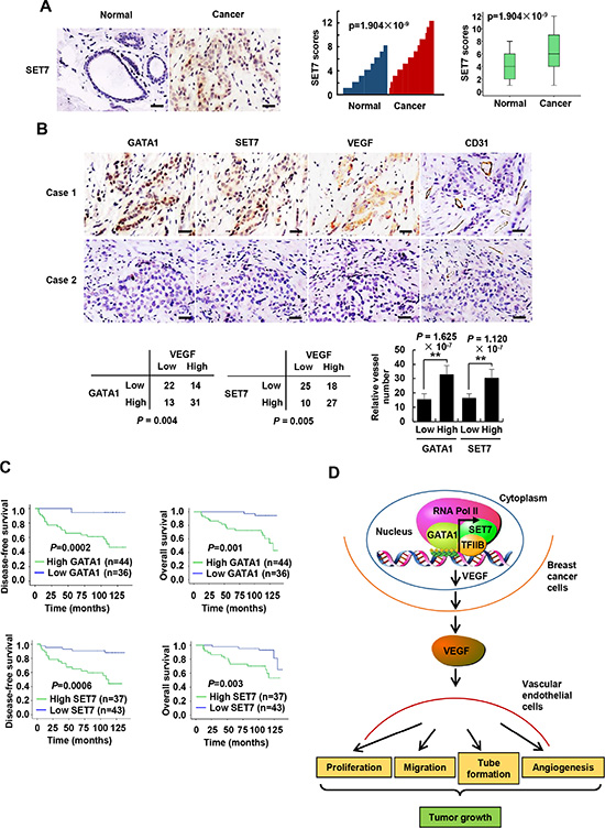 Figure 7: GATA1 and SET7 positively correlate with VEGF expression and are independent poor prognostic markers for breast cancer. (A) Representative immunohistochemical staining of SET7 in human cancerous breast tissues and adjacent normal breast tissues. Scale bar: 25 μm. SET7 expression scores were plotted and compared (Mann-Whitney U test). (B) Representative immunohistochemical staining of GATA1, SET7, VEGF and CD31 in human breast cancer samples. Scale bar: 25 μm. For the quantification of microvessel density, pictures from eight areas in each tissue were taken and the vessel number was counted. The correlation of GATA1 or SET7 with VEGF or microvessel number (positive CD31 staining) is shown. The P value was generated using Pearson’s χ2 test (GATA1, SET7 and VEGF) and Wilcoxon ranked sum test (CD31). (C) Kaplan-Meier estimates of disease-free survival (left panel) and overall survival (right panel) of breast cancer patients. Marks on graph lines represent censored samples. (D) Proposed model for GATA1 modulation of VEGF expression as well as its tumor-promoting function. GATA1 recruits SET7, TFIIB and RNA Pol II to VEGF core promoter, resulting in increased VEGF transcription and secretion in breast cancer cells. The cancer cell-secreted VEGF enhances vascular endothelial cell proliferation, migration and tube formation as well as tumor angiogenesis and growth.