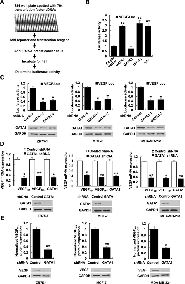 Figure 1: GATA1 regulates VEGF expression in breast cancer cells. (A) Schematic illustration of screening for transcription factors that regulate VEGF-Luc reporter activity in ZR75-1 breast cancer cells. (B) Luciferase reporter assays in ZR75-1 breast cancer cells cotransfected with the VEGF-Luc reporter and the indicated transcription factors from (A). All values shown are expressed as the mean ± SD obtained from two independent experiments. **P < 0.01 versus empty vector. (C) Luciferase reporter assays in ZR75-1, MCF-7 and MDA-MB-231 breast cancer cells cotransfected with VEGF-Luc and GATA1 shRNAs or control shRNA. Representative Western blot shows the expression of GATA1. GAPDH was used as a loading control. (D) Real-time RT-PCR analyses of the expression of VEGF121 and VEGF165, two major VEGF isoforms, in ZR75-1, MCF-7, and MDA-MB-231 cells stably infected with lentivirus carrying GATA1 shRNA or control shRNA. Representative Western blot indicates the expression of GATA1. (E) VEGF concentration in cell supernatants by ELISA and VEGF protein expression by Western blot from ZR75-1, MCF7 and MDA-MB-231 cells stably infected as in (D). Data shown are mean ± SD of triplicate measurements that have been repeated 3 times with similar results (C–E). *P < 0.05, **P < 0.01 versus control shRNA.