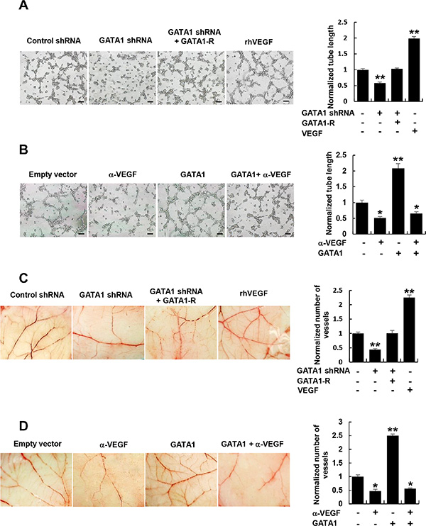 Figure 3: Cancer cell-secreted VEGF regulated by GATA1 modulates HUVEC tube formation and angiogenesis. (A) Tube formation assays for HUVEC cells cultured in the conditioned medium from MCF7 cells stably infected as in Figure 2A. (B) Tube formation assays for HUVEC cells cultured in the conditioned medium from MCF7 cells stably transfected and treated as in Figure 2B. (C) CAM assays with conditioned medium from MCF7 cells stably infected as in Figure 2A. (D) CAM assays with conditioned medium from MCF7 cells stably transfected and treated as in Figure 2B. The image displayed is one of the representative results (A–D). Scale bar: 100 μm (A, B). Recombinant human (rh) VEGF (10 ng/ml) (PeproTech) was used as a positive control (A and C). All values shown are mean ± SD of triplicate measurements and have been repeated 3 times with similar results (A–D). *P < 0.05, **P < 0.01 versus control shRNA or empty vector.