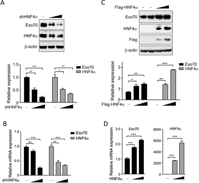 Figure 1: HNF4α regulates the expression of Exo70 protein. (A–B) Knocking down HNF4α decreased the protein and mRNA expression of Exo70. Hep G2 cells were transiently transfected with pLL3.7 vector or pLL3.7-shHNF4α plasmid. Cells were harvested 48 h after transfection and the whole cell lysate and the total RNA were prepared then subjected to Western blot (A) and real time PCR (B) analysis. (C–D) Ectopically expressed HNF4α upregulated the protein and mRNA expression level of Exo70 in cholangiocarcinoma cell line QBC939. Cells were transfected with pCMV10 vector or Flag-HNF4α plasmid, and harvested 48 h after transfection and subjected to Western blot (C) and real time PCR (D) analysis. Protein expression of Exo70, HNF4α and β-actin (used as loading control) were detected and quantified by densitometry; bar graph (A, C, down panel) showed the ratios of Exo70 or HNF4α to β-actin, and the basal level in the vector group was normalized to 1. GAPDH was used as normalization control for real time PCR. Data were presented as the means ± s.e.m. from three independent experiments. Differences between two groups as indicated in the graph were assessed by a two tailed unpaired Student’s t-test, *p < 0.05, **p < 0.01, ***p < 0.001 versus control.