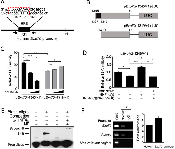Figure 3: Exo70 is a novel target gene of HNF4α. (A) Potential HNF4α binding site (HRE) in the promoter of the human Exo70 gene. (B) A schematic diagram for the different fragments of Exo70 promoter constructed into the luciferase reporter plasmid. (C) Effects of HNF4α on the activity of Exo70 promoter. Hep G2 cells were co-transfected with pExo70(-1345/+1)-LUC or pExo70(-1319/+1)-LUC, pLL3.7 or pLL3.7-shHNF4α, and the pRL-TK vector. Forty-eight hours after transfection, cells were harvested and the luciferase reporter assay was carried out. (D) The transactivation activity of HNF4α is required to regulate the transcription level of Exo70 promoter. Hep G2 cells were transiently transfected with pLL3.7 vector or pLL3.7-shHNF4α plasmid. Twenty-four hours after transfection, cells were transfected with pCMV10 vector, HNF4α silence mutation Flag-HNF4α(r) or Flag-HNF4α(r)(D69E/R76K), together with pExo70(-1345/+1)-LUC plasmid. After another 36 h, cells were harvested and the luciferase reporter assay was carried out. The basal level of transcriptional activity was normalized to 1. Data were presented as the means ± s.e.m. from three independent experiments. Differences between two groups as indicated in the graph were assessed by a two tailed unpaired Student’s t-test, *p < 0.05, **p < 0.01, ***p < 0.001, ns nonsignificant versus control. (E–F) Binding of HNF4α to the human Exo70 promoter was detected by EMSA (E) and ChIP (F). For EMSA, nuclear extract (NE) of Hep G2 cells was incubated with biotin-labeled oligonucleotides containing HRE elements in the Exo70 promoter. For ChIP, Hep G2 cells were harvested and then the ChIP assay was carried out to detect the interaction between endogenous HNF4α and the Exo70 promoter using anti-HNF4α antibody. The non-relevant region was PCR with a negative control primer pair which bound about 3 kilobases away from the putative HNF4a binding sites. Fold enrichment was calculated from a ratios between the signals of the Exo70 promoter (or ApoA-I promoter) and the negative control.