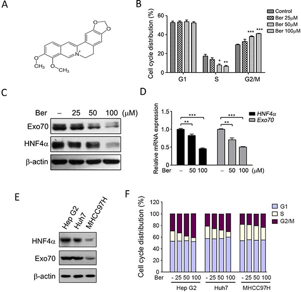 Figure 4: Berberine reduced the expression of HNF4α and Exo70, and induced cell cycle arrest at G2/M phase. (A)Chemical structure of berberine. (B) Berberine arrest the cell cycle of Hep G2 at G2/M phase. Cells were treated with different doses of berberine as indicated for 24 h, and then subjected to cell cycle analysis. (C–D) Berberine decreased the expression of HNF4α and Exo70. Human hepatoma Hep G2 Cells were treated with berberine (Ber) for 24 h, and then subjected to Western blotting or real-time PCR. The base level in each cell sublines were normalized to 1. Data were presented as the means ± s.e.m. from three independent experiments. Differences between two groups as indicated in the graph were assessed by a two tailed unpaired Student’s t-test, *p < 0.05, **p < 0.01, ***p < 0.001 versus control. (E–F) Down-regulation of HNF4α and Exo70 is essential to the G2/M cell cycle arrest in hepatoma cells with berberine treatment. Expression levels of HNF4α and Exo70 in three hepatoma cell lines were analyzed by Western blot (E). Hep G2, Huh7 and MHCC97H were treated with different doses of berberine for 24 h, then subjected to cell cycle analysis.