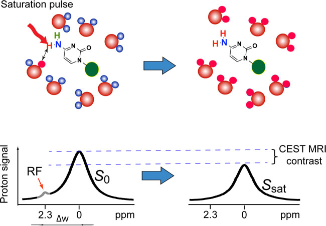 Figure 1: The principle of CEST MRI detection of anticancer drugs, such as gemcitabine. Exchangeable protons on the drug molecules can transfer RF saturation to the protons of surrounding water (top row), resulting in a decrease in MRI signal. Continuously applying RF pulses leads to the saturation of more water protons, generating a detectable MRI contrast called Chemical Exchange Saturation Transfer (CEST) contrast (bottom row).