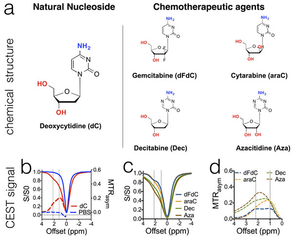 To test our hypothesis, we first examined the four widely used cytidine analogue anticancer drugs, gemcitabine (dFdC), cytarabine (araC), decitabine (Dec), and azacitidine (Aza), which are either approved or in clinical trials, and their natural analog deoxycytidine (dC). As shown in Figure 2a, all drugs have a chemical structure similar to that of deoxycytidine. Our in vitro results showed that, as expected, all of these anticancer drugs (in PBS solution, pH = 7.4 and 37°C) exhibited two strong CEST MRI signals, around 2.0-2.4 ppm and 1.0 ppm, corresponding to the amino and hydroxyl protons respectively. In Figure 2b-2d, CEST signals are shown in both Z-spectra (solid lines), in which the water proton signal is plotted as a function of saturation frequency, and in MTRasym plots (dotted lines), a more quantitative metric defined by: MTRasym = (S-Δω - SΔω)/S0, where S-Δω and SΔω are the MRI signal intensities after saturation at negative and positive values of the offset frequency Δω from the water proton frequency (set at 0 ppm by convention); S0 is the intensity in the absence of a saturation pulse. Maximal MTRasym values of 0.119±0.007 and 0.129±0.025 could be achieved for 20 mM dFdC at offsets of 2.2-2.3 ppm and +1.0 ppm, respectively, when a continuous wave RF (B1 = 3.6 µT and tsat = 4 sec) saturation pulse was used.