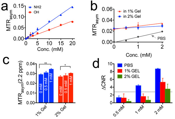 We used two methods to determine the minimum detection sensitivity. First, we performed a statistical analysis (the two-tailed, unpaired Student’s t test, n = 3) to determine the minimum concentration of gemcitabine that can generate a significant difference in CEST signal between just agarose gel and gemcitabine containing agarose gel. As shown in Figure 4c, a significant difference could be achieved for samples containing 1 mM or higher gemcitabine but not those containing 0.5 mM gemcitabine. The P values were determined to be 0.0007 and 0.0106 for 1 mM gemcitabine in 1% and 2% agarose gel respectively, with both showing significant differences (i.e., P < 0.05) compared to the reference gel samples. Second, we also adapted a previously published contrast-to-noise Ratio (CNR)-based approach [16] to determine the detection threshold in the presence of systemic noise. As shown in Figure 4d, when a ∆CNR threshold of 2√2 was used [16], the minimum detection sensitivity was estimated to be <1 mM for PBS samples and 1-2 mM for gel samples. It should be noted that the estimation of CEST detectability is affected by the choice of CNR threshold and CNR thresholds in different range (i.e., 0.6-2) have been reported previously [17, 18]. When a ∆CNR threshold = 1 was used, for instance, the detection limit was estimated to be 0.5 mM for gemcitabine in 1% agarose gel. In comparison, the typical detectability for small molecular Gd-based contrast agents is in the range of hundreds μM to mM [19] and that of 19F MRI is in the range of tens of mM [20]. Our study suggests that CEST MRI can provide a similar detectability as those imaging contrast generation strategies.