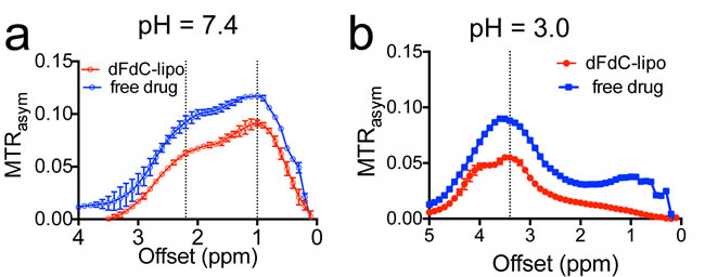 Figure 6: The CEST of liposomal dFdC (~80 nM per liposome) and compared with that of free drug (10 mM) at a. pH 7.4 and b. pH 3.0.
