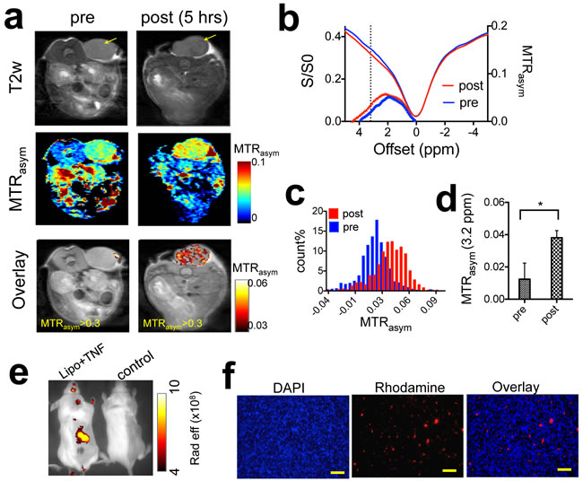 Figure 7: In vivo detection of the tumor uptake of liposomal gemcitabine using CEST theranostics. a. CEST MRI detection of a CT26 tumor (co-treated with TNF-α) before and five hours after the i.v. injection of liposomal dFdC. From top to bottom: T2w images; CEST maps at ~ 3.2 ppm; and CEST/T2w overlaid images (only the CEST in the tumor region is shown). b. Mean tumor CEST signal (MTRasym plots an Z spectra) before and after the injection. c. Histogram of the MTRasym values within the tumor regions, before and after the injection of liposomes. d. Statistical analysis of mean CEST signal changes in the tumor regions after the injection (n = 3). e. Whole body fluorescence imaging of a representative mice injected with liposomal dFdC (Gem-lipo) in the presence TNF-α, and a control mouse (saline injection). f. Histopathology of tumor section, clearly showing the accumulation and distribution of rhodamine-B-labeled liposomes in the tumor co-injected with liposomes and TNF-α. Nuclei are stained with DAPI (blue). (Scale bar = 100 μm).