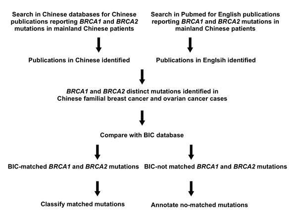 Mainland China has a population size of nearly 1.4 billion, accounting for one fifth of the human population worldwide. However, limited information about BRCA mutations in this large population is available in current BRCA variation databases. For example, only 13 of the 1,791 BRCA1 variants and three of the 2,000 BRCA2 variants in the Breast Cancer Information Core (BIC) database were derived exclusively from mainland Chinese patients [15]. We hypothesized that 1) BRCA variation may be common in this population, and 2) many variants representing potential mutations may have already been identified but this information is unknown outside the Chinese scientific community, because many Chinese scientists publish in Chinese rather than in English and most Chinese medical and health science journals are not included in international journal databases [16]. To test our hypothesis, we performed an extensive survey of Chinese and English scientific literature to collect BRCA variant data derived solely from mainland Chinese familial breast and ovarian cancer patients (Figure 1).