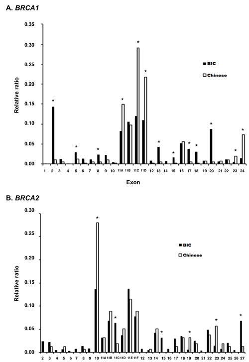 Figure 3: Comparison of exon distribution frequencies of BRCA variation between mainland Chinese and BIC populations. Relative ratios between these two datasets were used for the comparison (see text for the details). Chi square (χ2) and Fisher exact test were used for statistics analysis. “*” refers to p < 0.05 (actual P values listed in Supplementary Table 5). A. Variant distribution in BRCA1. B. Variant distribution in BRCA2.