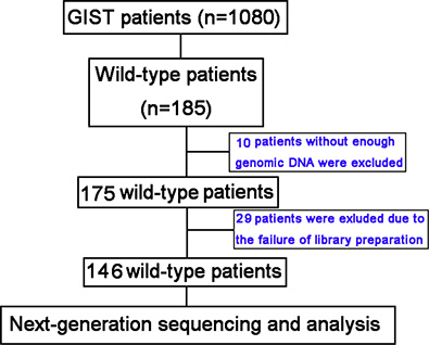 Figure 3: Patient screening flow chart. From 1,080 patients studied for KIT/PDGFRA mutations, 185 were KIT/PDGFRA wild-type and 146 were analyzed using targeted next-generation sequencing (NGS). There was insufficient genomic DNA or the library preparation failed for 39 patients.