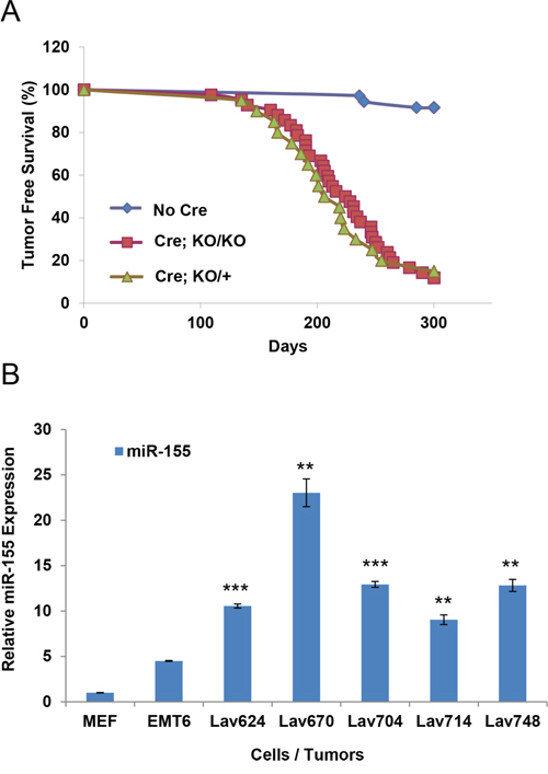 Figure 1: Effect of miR-155 on the tumor free survival of Brca1cko/cko;Trp53cko/cko;K14-Cre mice. A. Tumor free survival of Brca1cko/cko;Trp53cko/cko;K14-Cre on miR-155ko/+ (Cre; KO/+) or miR-155ko/ko (Cre; KO/KO) genetic backgrounds. Mice without K-14 Cre (No Cre) were used as control. B. Real-time PCR-based quantification of miR-155 in Brca1cko/cko;Trp53cko/cko;K14-Cre tumors. Lav624, 670, 704, 714 and 748 cells are from miR-155 KO/+ tumors. MEF (Mouse embryonic fibroblast) and EMT6 (mouse mammary tumor cell line with WT BRCA1) were used as controls. **p<0.01, ***p<0.001 for all panels. Representative result of three experiments.