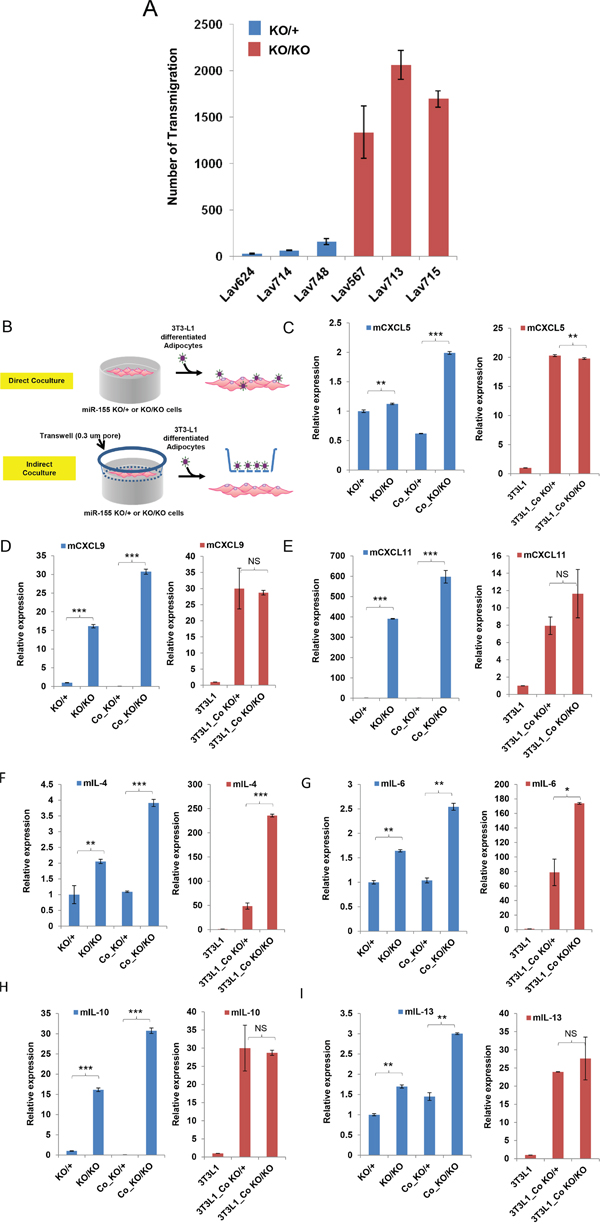 Figure 3: Loss of miR-155 stimulates MDSC migration and up-regulates cytokine/chemokine expressions. A. Migration assay of MDSC cells treated with culture media from miR-155ko/+ (KO/+) or miR-155ko/ko (KO/KO) breast cancer cells. Bars 1-3 represent breast cancer cells that are miR-155ko/+ (KO/+) and 4-6 represent miR-155ko/ko (KO/KO) cells. Lav624, 714, and 748 cells are from KO/+, and Lav567, 713, and 715 cells are from KO/KO tumors. B. Schematic diagram showing cancer cell/adipocyte co-culture. For indirect co-culture, transwell was applied. C-E. Real time PCR results of the chemokines that are pre-screened from cytokine/chemokine array. Co- indicates co-culture C:CXCL5, D:CXCL9, E:CXCL11. (F-I) Real time PCR results of cytokines. F: IL-4, G: IL-6, H: IL-10, I: IL-13. *p<0.05, **p<0.01, ***p<0.001 for all panels. Representative result of two (A) or three experiments (C-I).