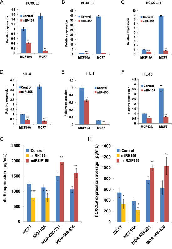 We next examined if miR-155-mediated cytokine/chemokine regulation also occurs in human breast cancer cells. We transfected MCF7 and MCF10A cells that have low levels of endogenous miR-155 with miR-155 mimic. The transfectants were then indirectly co-cultured with differentiated adipocytes as shown in Figure 3B. We measured RNA expression levels of cytokine/chemokines including CXCL5, 9,11 and IL-4,6,10, which are shown to be up-regulated in Figure 3C-H. As shown in Figure 4A-F, over-expression of miR-155 mimic in both cells dramatically decreased the expression of the cytokines, although the relative basal level was low for some cytokines (e.g., CXCL9 in MCF10A). The cytokine regulation by miR-155 was further confirmed by ELISA assay for IL-6 and CXCL9 by over expressing miR-155 in MCF7 and MCF10A (low endogenous miR-155) and silencing miR-155 in MDA-MB-231 and MDA-MB-436 (high endogenous miR-155). We observed significant reduction in the levels of the two cytokines by miR-155 over-expression (miRH155) whereas inhibition of the miR-155 (miRZIP155) increased cytokine production (Figures 4G and H). These results support our findings from the mouse model and demonstrate that the miR-155-mediated cytokine regulation occurs in human cells as well.