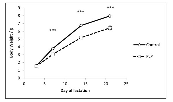 Figure 1: Effect of maternal diet on body weight during lactation. Body weights of offspring were measured at day 3, 7, 14 and 21 and were consistently lower from day 7 onwards in the PLP group (***p < 0.001) compared to control animals. n = 16-30 per group. Data are represented as mean +/- SEM.