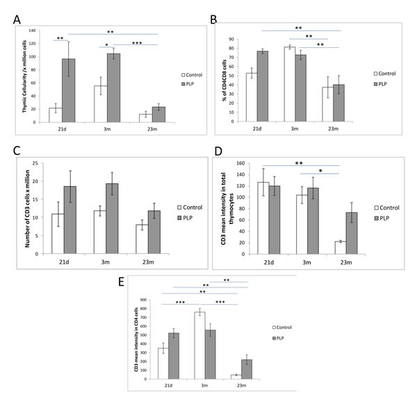Figure 2: Effect of age and maternal diet on thymic cellularity and development. A. Thymic cellularity was significantly affected by age (p < 0.001). PLP offspring had significantly higher thymic cellularity compared to control animals (p < 0.001) especially at 21d and 3m. B. The proportion of DP CD4+ CD8+ cells as measured by flow cytometry, significantly decreased with age (p < 0.001). However there was no effect of maternal diet. C. The number of CD3+ thymocytes were significantly higher in PLP offspring compared to control animals (p < 0.05). However there was no significant effect of age on these cells. D. The density of CD3 expression on total thymocytes decreased significantly with age (p < 0.01). E. The level of CD3 expression in CD4+ cells peaked at 3m, and decreased by 23m of age (p < 0.001). However this change with age was less substantial in PLP animals (p < 0.05). *p < 0.05, **p < 0.01, ***p < 0.001. n = 5-9 per group. Data are represented as mean +/- SEM.