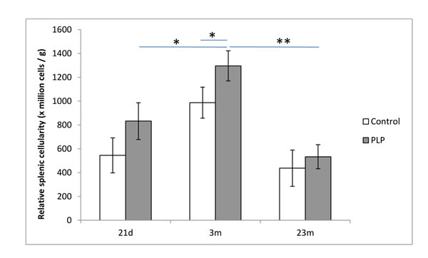 Figure 3: Relative splenic cellularity in aging PLP and control mice. In order to detect the effect of age and maternal diet on splenic involution, splenic cellularity was quantified using a Countess Automated Cell counter (Invitrogen, Paisley, UK) and represented in relation to splenic weight. Relative splenic cellularity decreased significantly in old age (p < 0.01) and was significantly higher in PLP offspring compared to control animals (p < 0.05). *p < 0.05, **p < 0.01. n = 5-9 per group. Data are represented as mean +/- SEM.
