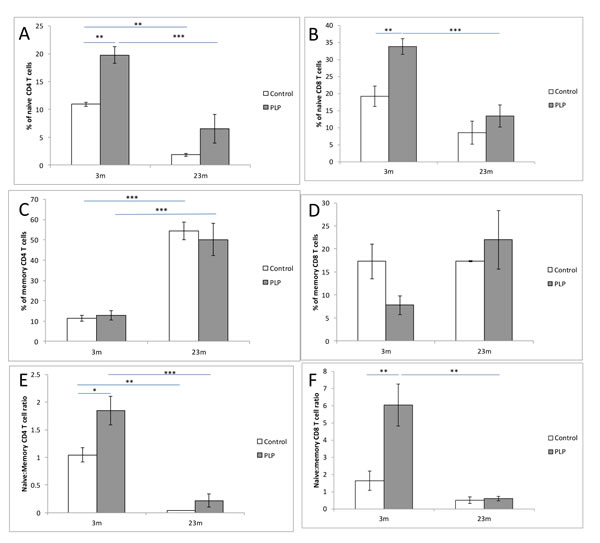 Given the observed changes in the thymus, the secondary lymphoid tissue, the spleen was investigated. Splenic development peaks at puberty which is followed by gradual involution throughout life [23]. As reported in previous studies, relative splenic cellularity decreased with age [35]. However relative splenic cellularity was increased at each time point in the PLP group suggesting a slower rate of splenic aging in these animals. Although recent thymic emigrants are fewer in number and diversity with increasing age, homeostatic mechanisms are in place to ensure a constant size of the peripheral B and T cell pool [20]. Therefore PLP animals are likely to require less clonal T cell expansion in order to maintain the same peripheral T cell numbers with increasing age.