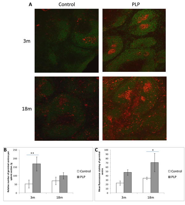 In order to determine the effect of age and maternal diet on B cell activity, staining of GCs was performed (Figure 5A). PLP animals had a significantly (p < 0.05) higher relative number of GCs per section of spleen compared to control animals especially at 3m of age (Figure 5B). The fluorescence intensity of GCs was also significantly (p < 0.01) higher in the PLP group compared to the control group especially at 18m of age (Figure 5C). There was however no statistically significant effect of age on these parameters. Taken together these results suggest that PLP animals have greater GC activity compared to controls.