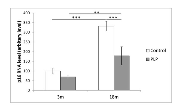 Figure 6: Effect of age and maternal diet on relative gene expression of p16 in the spleen. Gene expression levels were measured by quantitative RT-PCR. Values are expressed with mean gene expression in the spleen from 3m control mice being set as 100. Gene expression of p16 was significantly affected by both age (p < 0.001) and maternal diet (p < 0.001). However PLP animals had a less marked age-associated increase in expression compared to controls. **p < 0.01, ***p < 0.001. n = 6-8 per group. Data are represented as mean +/- SEM.