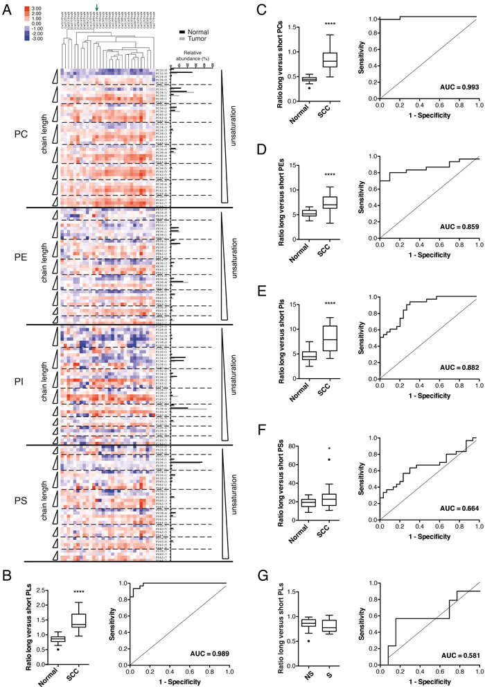 Phospholipid profiles of tumor and matched normal tissue from 30 lung SCC patients (see Supplementary Table S1 for patient characteristics) [6] were subjected to a more extensive data analysis and heat mapping to reveal any patterns of changes and to uncover alterations in specific lipid-related pathways. Supervised ranking of lipid species according to their combined acyl chain length revealed a dramatic and recurrent increase in the relative abundance of phospholipid species with longer acyl chains (larger total number of acyl chain carbon atoms) at the expense of shorter species in the four phospholipid headgroup class that were analyzed (phosphatidylcholine (PC), phosphatidylethanolamine (PE), phosphatidylinositol (PI) and phosphatidylserine (PS)) (Figure 1A). To better quantify these changes we have calculated a combined acyl chain length index by comparing the total abundance of phospholipid species with longer fatty acyl chains (≥ 36 carbon atoms in the two acyl chains together) versus species with shorter fatty acyl chains (≤ 34 carbon atoms). When applied for all phospholipid species together, a significantly higher value was found in SCC tumor tissue compared to normal lung tissue (AUC = 0.989; p<0.0001; Figure 1B). For an acyl chain length index set at 1, longer acyl chains were found in 96.7% of SCC, with a corresponding specificity of 90.0% (Figure 1B). Calculation of the acyl chain length index for each phospholipid headgroup class separately, revealed a similar trend (Figure 1C-1F), with PC being the most affected with an almost perfect correlation (AUC = 0.993; p<0.0001) of acyl chain length index and tumor tissue identification (Figure 1C). To exclude that the observed differences in acyl chain length simply reflect smoking behavior, we have compared the acyl chain length index of normal tissues from smokers versus patients who have quit smoking for more than 6 months. No difference was observed (Figure 1G).